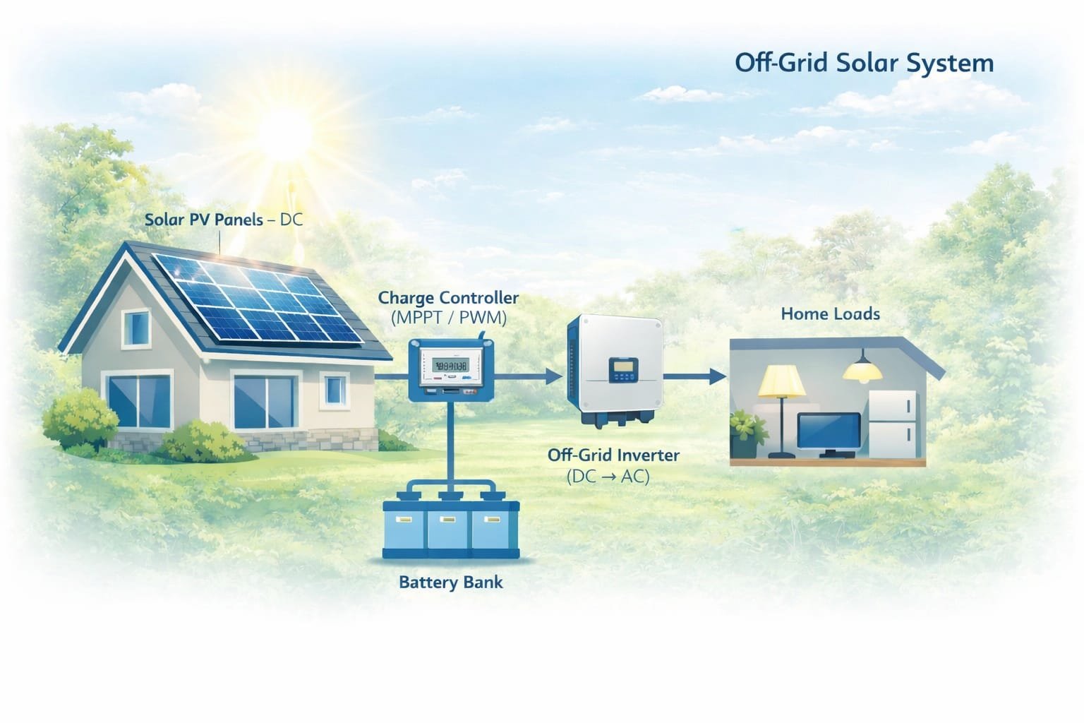 An off-grid solar system enables users to generate solar electricity on-site, store excess energy in batteries, and use it whenever required—ensuring uninterrupted power through a self-sufficient, standalone solar setup.
